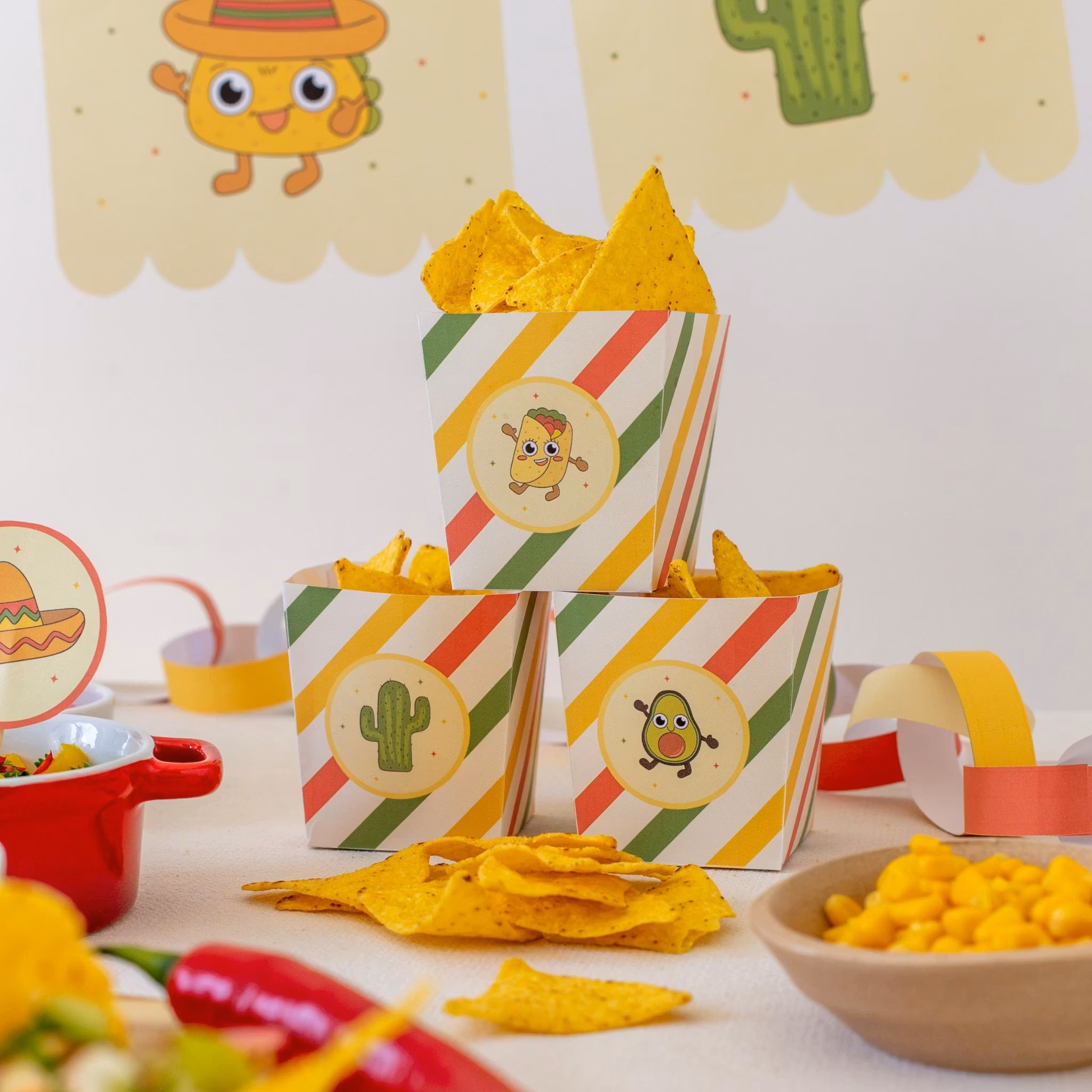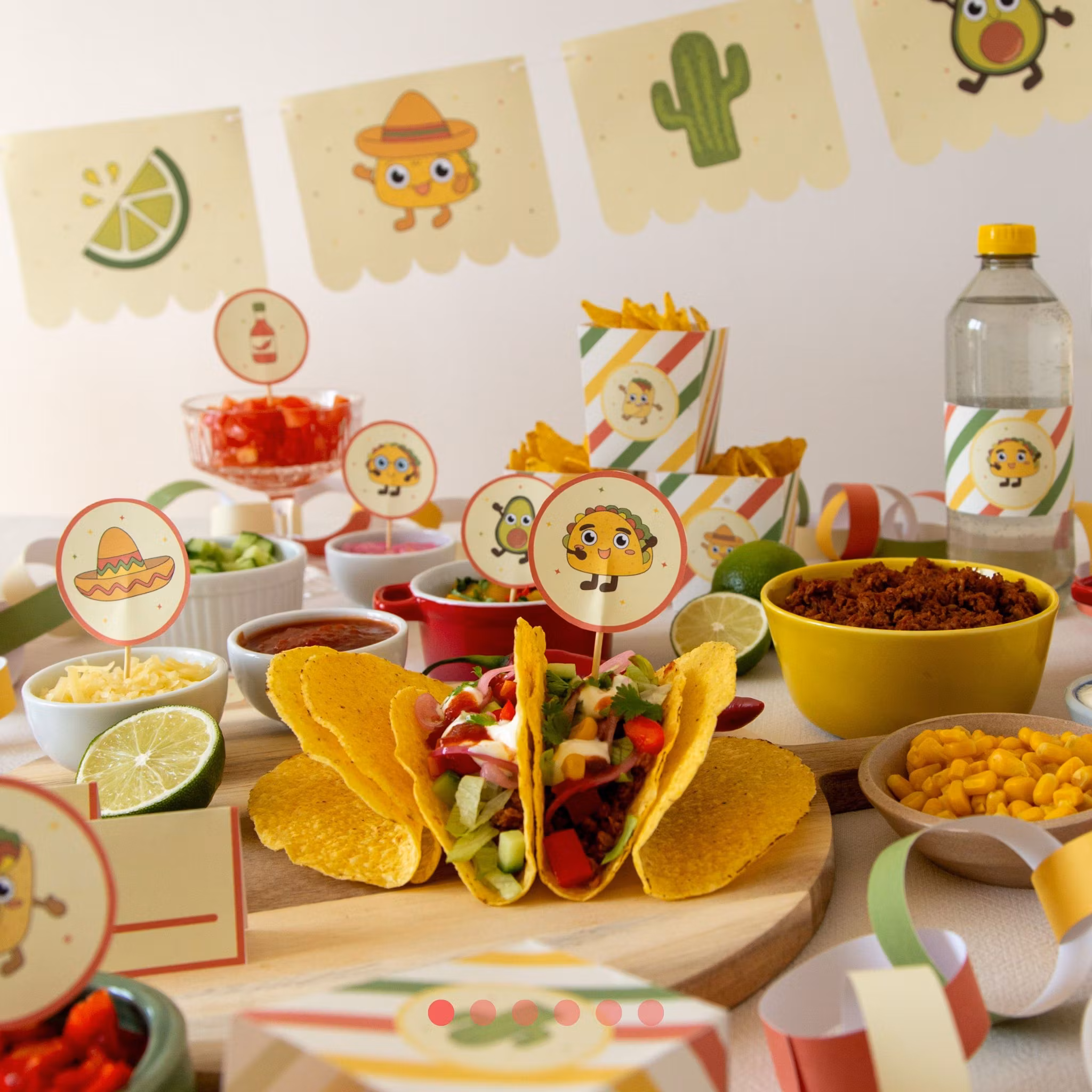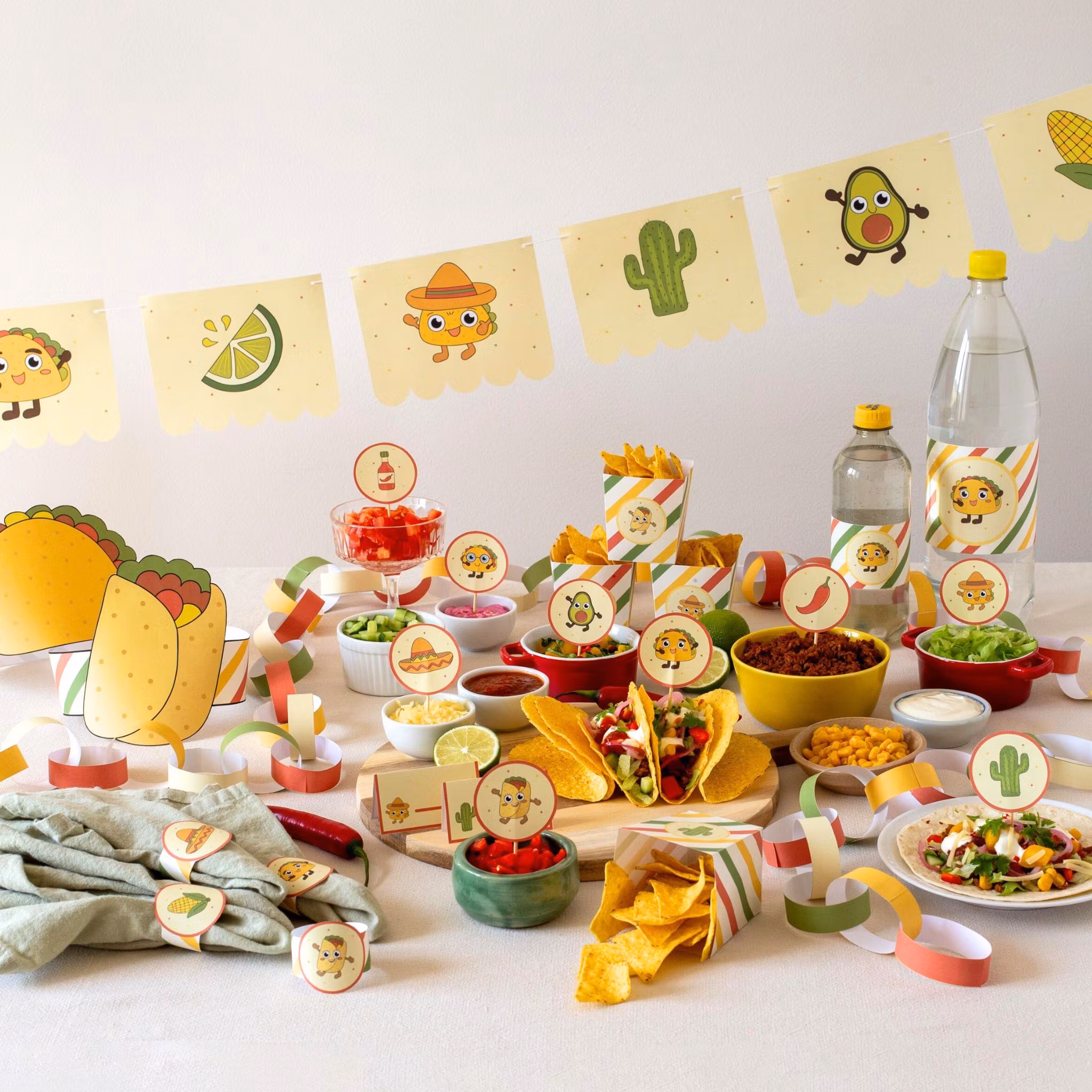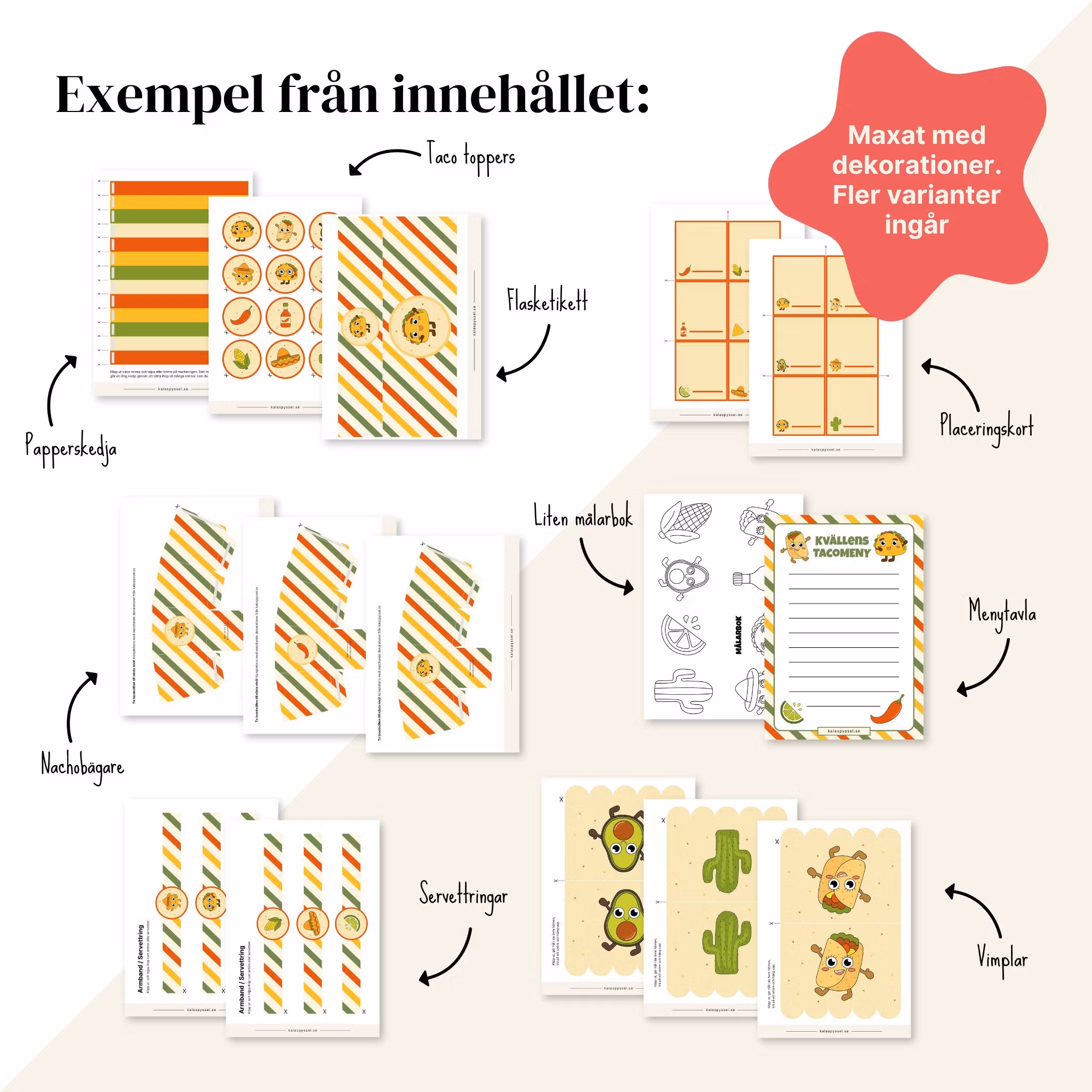 Pyssla ihop din egen tacokväll! Matchande dekorationer och aktiviteter till tacokvällen. Utklippsvänligt med smart layout - raka delar ligger tätt så du kan klippa effektivt.