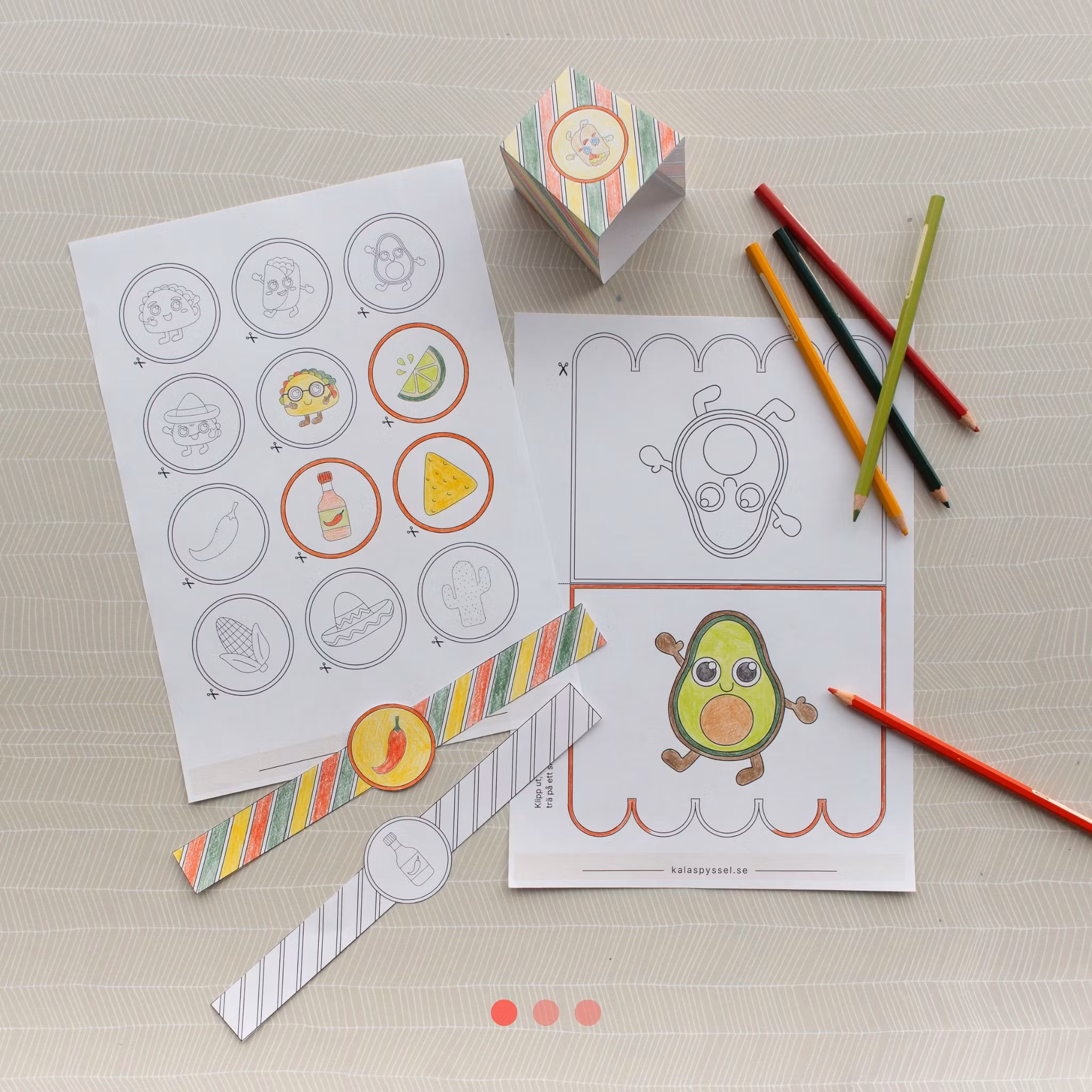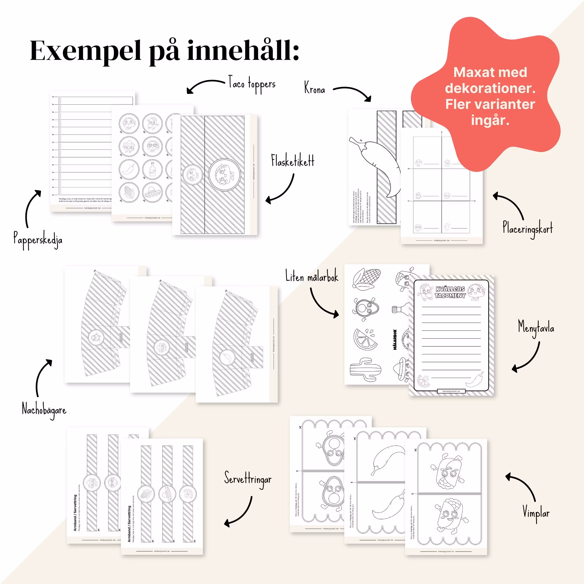 Pyssla ihop din egen tacokväll! Matchande dekorationer och aktiviteter till tacokvällen. Svartvita bilder för barnen att färglägga själva. Utklippsvänligt med smart layout - raka delar ligger tätt så du kan klippa effektivt.